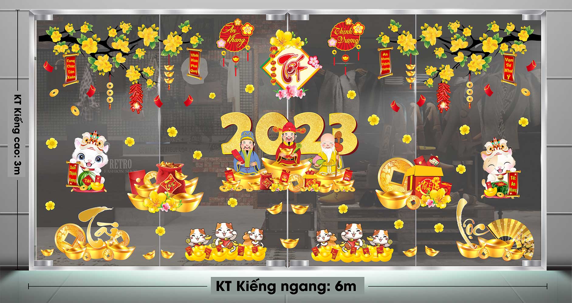 DECAL COMBO PHÚC LỘC THỌ VÀ ĐÔI MÈO TÀI LỘC