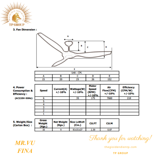 | Chiều cao quạt | 250mm nếu trần nhà quá thấp có thể cắt ngắn ty hay có thể kéo dài ty treo quạt nếu trần quá cao |